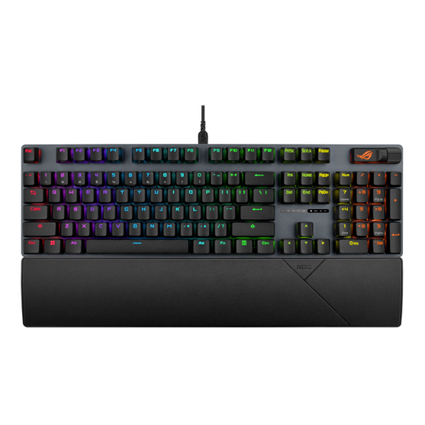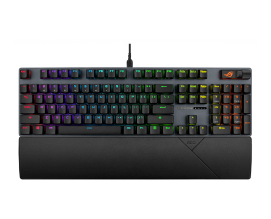 | Karakteristike tipkovnice | Mehanički prekidači ROG NX V2 - pružaju mekšu akustiku i bolji osjećaj tipkanja Intuitivne kontrole: Višenamjenska tipka i višenamjenski kotačić za reprodukciju medija, glasnoću i osvjetljenje tipkovnice Integrirana pjena apsorbira zvukove pinganja i odjeke za poboljšanu akustiku Izdržljive ROG PBT kapice tipki ili UV-premazane ABS kapice tipki nude vrhunski osjećaj i otpornost na sjaj Ergonomski dizajn: Tri položaja nagiba i odvojivi oslonac za zglob RGB pozadinsko osvjetljenje po svakoj tipki |