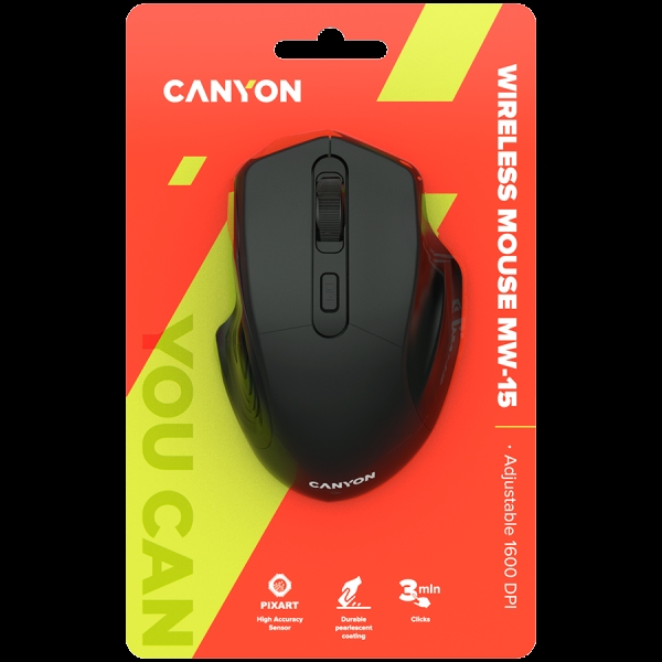 CANYON MW-15, 2.4GHz Wireless Optical Mouse with 4 buttons, DPI 800/1200/1600, Black, 115*77*38mm, 0.064kg
