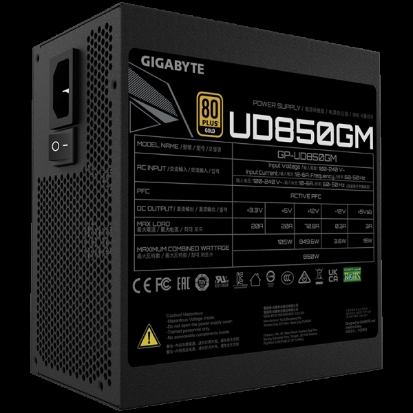 GIGABYTE UD850GM Ultra Durable Power Supply 850W, Modular, 80 PLUS Gold, Japanese capacitors, 120mm smart control fan, EU plug