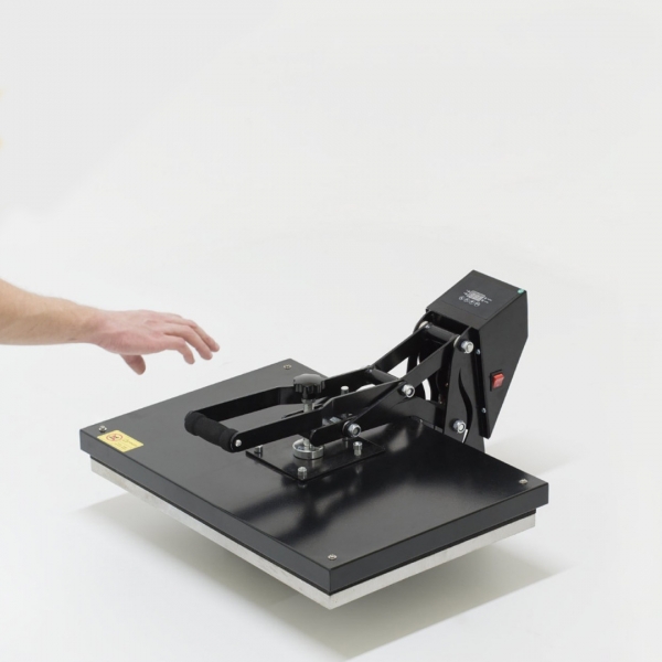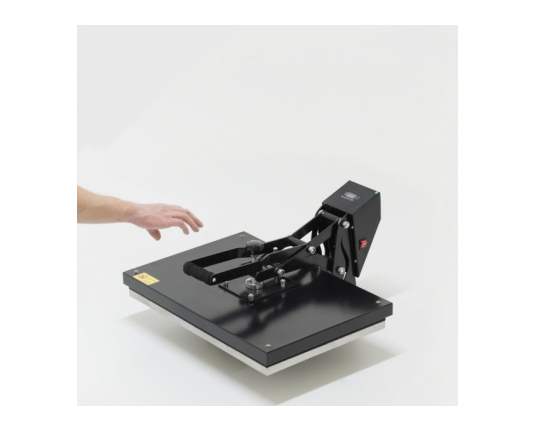 - Termo preša 38x38 cm, ravna i s ručnim otvaranjem, s pločama veličine 38x38 cm. Otvaranje knjige prema gore
