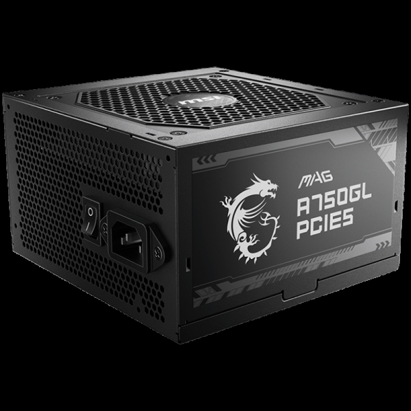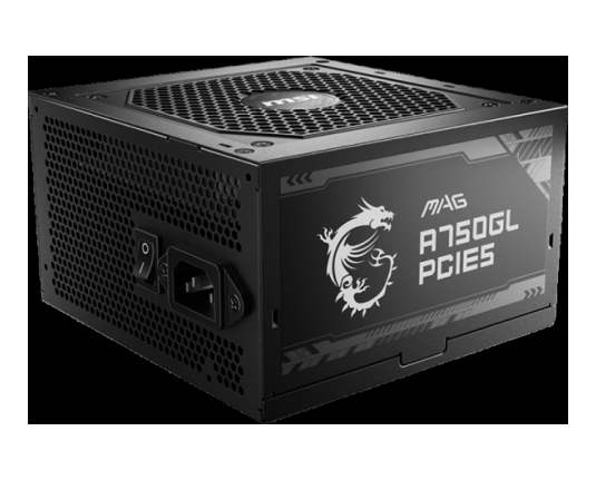 MSI MAG A750GL PCIE5, 750W, 80 Plus Gold, ATX Form Factor, 100~240 Vac Input Voltage, 47Hz ~ 63Hz Input Frequency, 120 mm Fan, 140 x 150 x 86mm, Active PFC, OCP, OVP, OPP, OTP, SCP, UVP, ATX, 2xEPS, 4XPCi-E, 8xSATA, 4xMOLEX, 1xFDD, 7Y