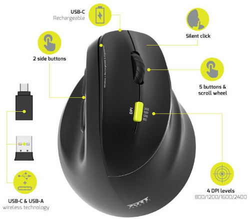 | Kratki opis | Ergonomični miš s nagnutim dizajnom za prirodan položaj ruke i optimalnu udobnost Bežična tehnologija 2,4 GHz + Bluetooth® Ugrađena punjiva baterija s USB-C kabelom za punjenje Prilagodljivi optički senzor brzine: 800 / 1200 / 1600 / 2400 DPI Tihi klikovi za mirno radno okruženje 5 tipki i kotačić za pomicanje |