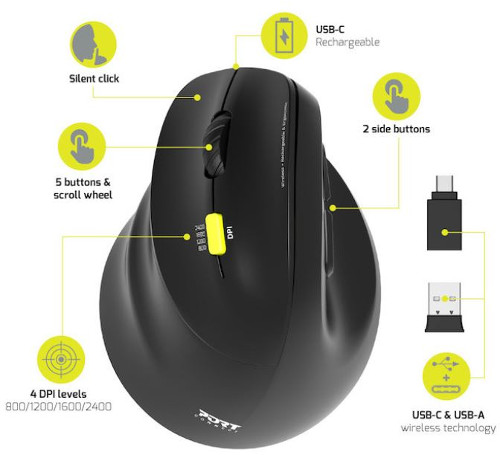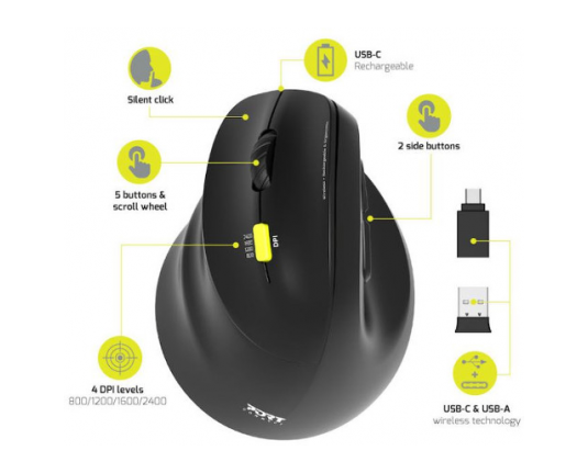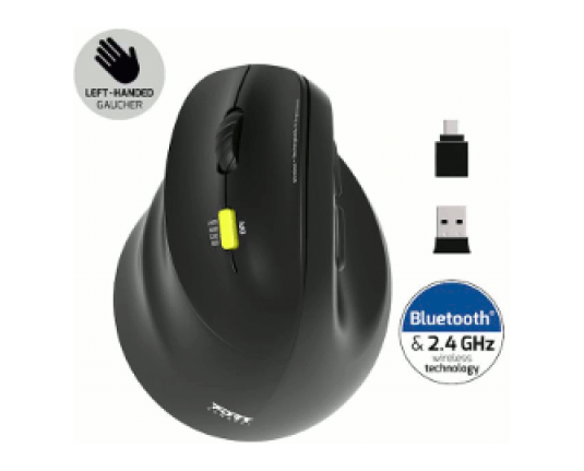 | Kratki opis | Ergonomični miš s nagnutim dizajnom za prirodan položaj ruke i optimalnu udobnost Bežična tehnologija 2,4 GHz + Bluetooth® Ugrađena punjiva baterija s USB-C kabelom za punjenje Prilagodljivi optički senzor brzine: 800 / 1200 / 1600 / 2400 DPI Tihi klikovi za mirno radno okruženje 5 tipki i kotačić za pomicanje |