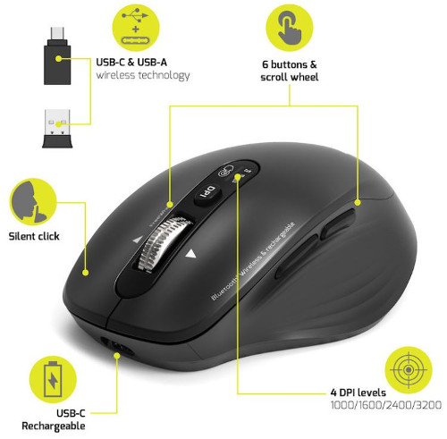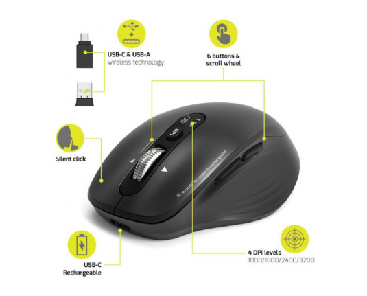 | Kratki opis | Optički senzor s prilagodljivom brzinom: 1000 / 1600 / 2400 / 3200 DPI Tihi klikovi za mirno radno okruženje 6 tipki, uključujući tipku za odabir bežične veze Optimizacija baterije putem načina mirovanja i ON/OFF tipke Ugrađena punjiva baterija s USB-C priključkom |