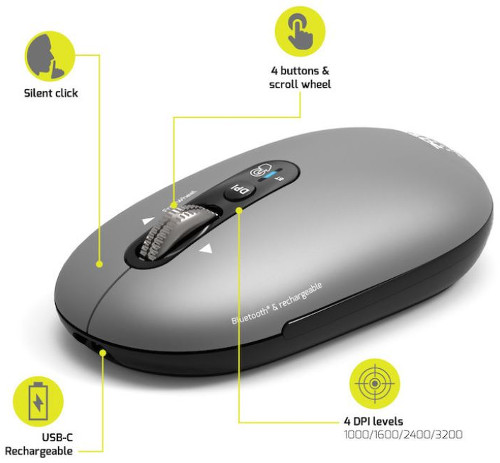 Profesionalni bežični miš s Bluetooth® tehnologijom Ugrađena punjiva baterija s USB-C priključkom FreeWheel® tehnologija za izuzetno brzo i precizno pomicanje Navigacija lijevo/desno pomoću kotačića za pomicanje Prilagodljivi optički senzor brzine: 1000 / 1600 / 2400 / 3200 DPI Način odabira uređaja omogućuje povezivanje s 2 različita uređaja (putem Bluetooth® veze) Tihi klikovi za mirno radno okruženje 4 tipke, uključujući tipku za odabir bežične veze Optimizacija trajanja baterije putem načina mirovanja i ON/OFF tipke |
