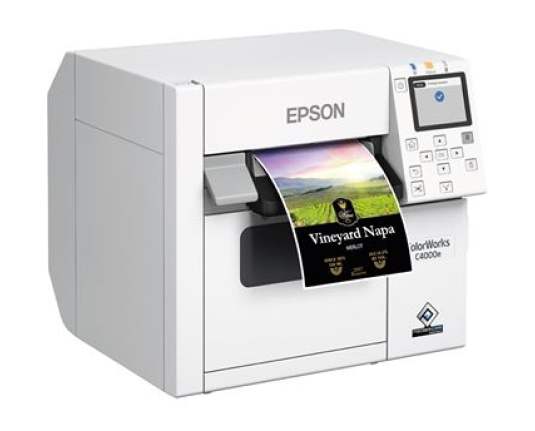 Epson ColorWorks C4000, pisač naljepnica u boji, ink-jet (višebojni), Gloss Black Ink, rezač, ZPLII, USB, Ethernet, širina medija (maks.): 112 mm, širina ispisa (maks.): 108 mm, promjer role (maks.): 102 mm, brzina (maks.): 100 mm/ s, USB, Ethernet (10/100/1000 Mbit), emulacija: ZPLII, rezač, Black Mark Sensor, Gap Sensor, uklj.: kabel (USB), jedinica za napajanje, kabel za napajanje, tintni uložak, QSG