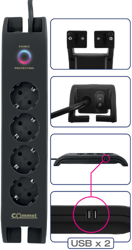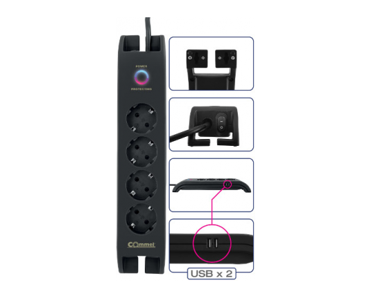 | Ostalo | Utičnica 4-struka s prenaponskom zaštitom Prenosive utičnice sa prenaponskom zaštitom suvremenog dizajna dostupne u crnoj i bijeloj boji. Novi dizajn, osim atraktivnog izgleda omogućuje dodatne značajke kao što su: - zaštita od prenapona – štiti priključne uređaje od prenapona uzrokovanog udarom groma u električnu mrežu. - mogućnost pričvršćivanja vijcima za ravnu površinu - “bridge” izgled prenosive utičnice omogućava urednu organizaciju priključenih kablova. - LED indikator Boja: crna Broj utičnica: 4 Dužina kabela: 2 m Max opterećenje: 16 A / 3680 W Nazivni napon: 250 V~ 50Hz Presjek kabela: 3G1,5 Tip kabela: H05VV-F 3G1,5 USB: 2xUSB-A |