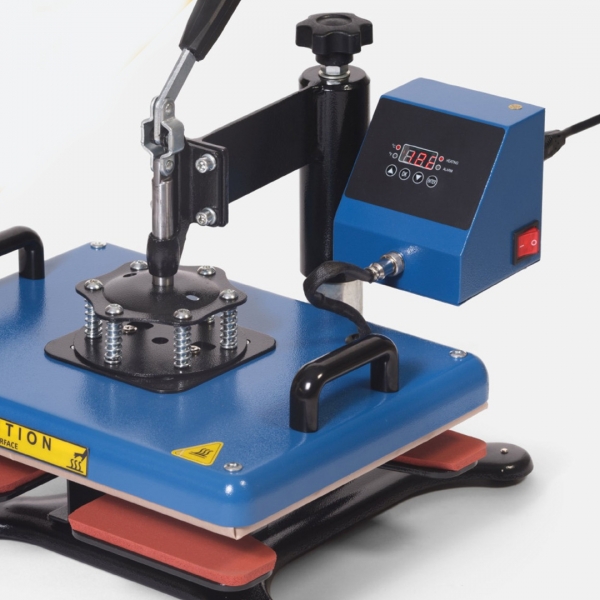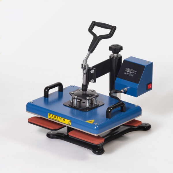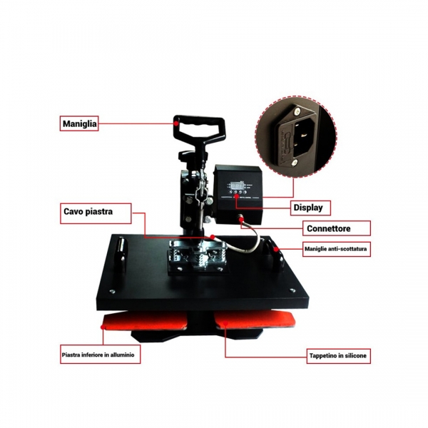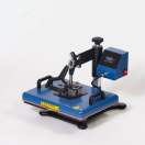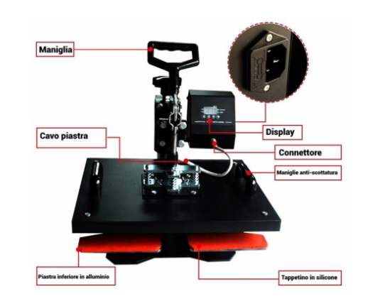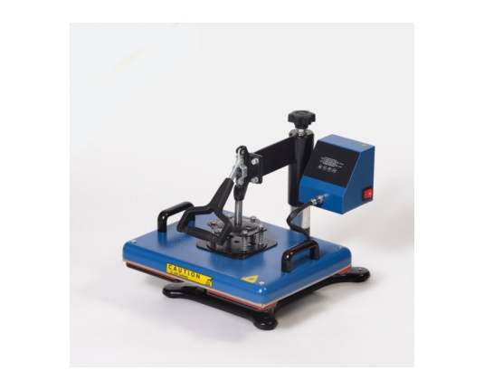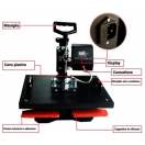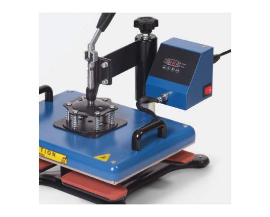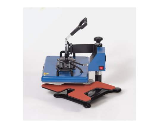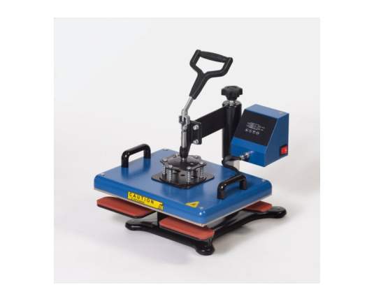 Ravna termo preša s ručnim otvaranjem, opremljena oblikovanom donjom pločom koja omogućuje umetanje i tiskanje cipela (ali i drugih posebnih predmeta). Gornji tanjur dimenzija 29 x 38 centimetara.