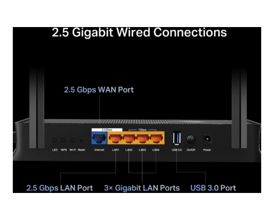 | Priključci | 1× 2.5 Gbps WAN 1× 2.5 Gbps LAN 3× 1 Gbps LAN 1× USB 3.0 |