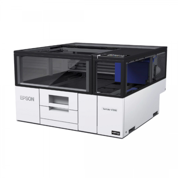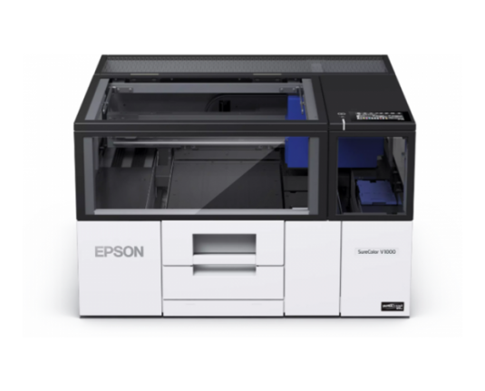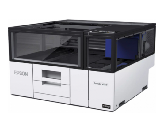 Epson SC-V1000 je A4 LED UV plošni pisač. Kompaktno je i praktično rješenje za ispis na krutim medijima, poput promotivnih i personaliziranih predmeta. Ima male dimenzije (699 mm x 699 mm), savršen je za mala poduzeća, fotografske trgovine, centre za ispis, e-trgovinu i turističke atrakcije. Može ispisivati predmete debljine do 70 mm, poput akrila, metala i drva. Opremljen je rotirajućom glavom kako bi mogao ispisivati čak i na zakrivljenim površinama (loptice za golf, olovke itd.). Nudi visokokvalitetni ispis zahvaljujući sustavu tinte sa 6 boja (CMYK plus bijela i prozirna/sjajna) i omogućuje prilagodbu sjajnim ili mat efektima. Održavanje je smanjeno zahvaljujući automatskom sustavu čišćenja i korištenju RIPS sustava, što omogućuje brzu i jednostavnu zamjenu tinte. Opremljen je filterima za zrak za smanjenje mirisa i uključuje Epson Edge Print RIP softver. Uključena je povezivost putem USB-a, Wi-Fi-ja i trogodišnje jamstvo.